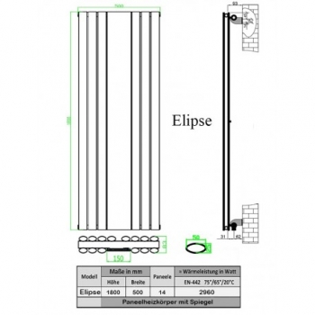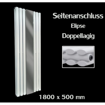 Paneelheizkörper mit Spiegel 1800x500 Doppellagig Weiß Ellipse Mittelanschluss